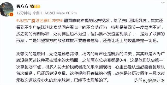 不久前,媒体人勇方方发文说道:除了赛后那场风波,其实还看到不少广厦球迷比赛期间在看台上的不文明行为,特别是第四节一度骂声不断,按之前的判例标准,处罚赛区也不为过,但我就不发这些视频了,一是为了联赛的形象,二是希望双方的敌意螺旋不要越来越高,还是让场上的较量决定一切吧。