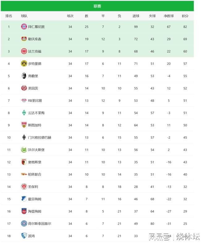 至此,本赛季德甲联赛落下帷幕,各队排名最终敲定。拜仁慕尼黑早早锁定联赛冠军,勒沃库森早早拿到欧冠资格,末轮法兰克福、弗赖堡和多特蒙德竞争2个欧冠席位。